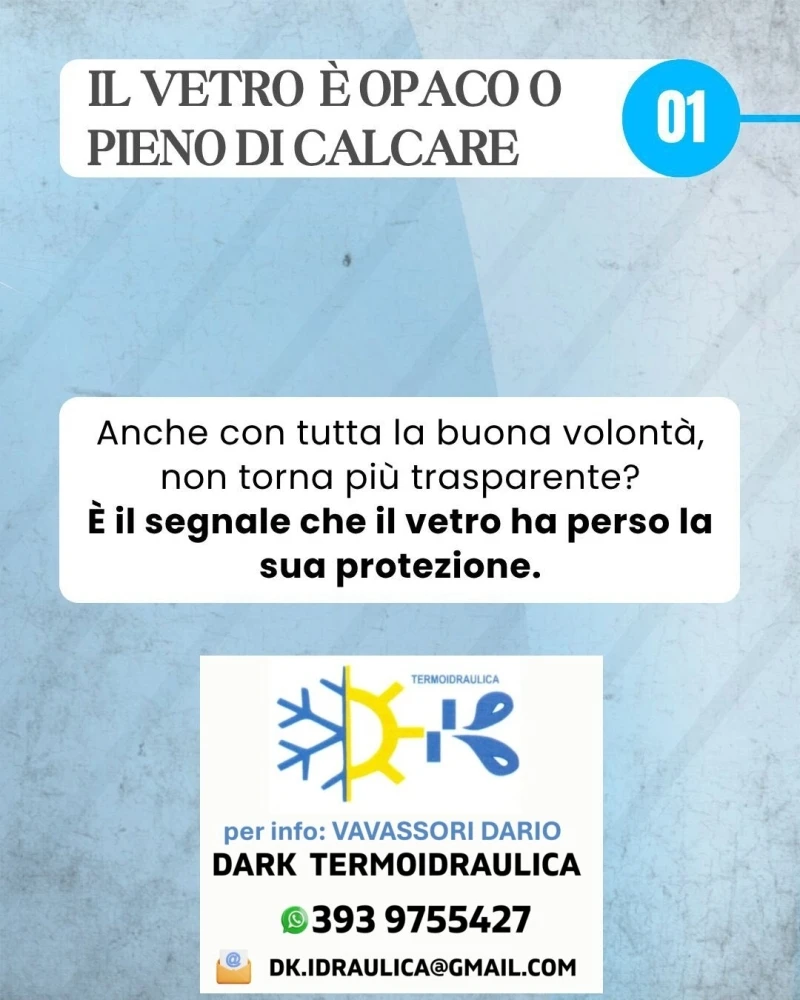 - Il vetro è opaco o pieno di calcare ... anche con tutta la buona volontà, non torna piu' trasparente. E' il segnale che il vetro ha perso la sua protezione: