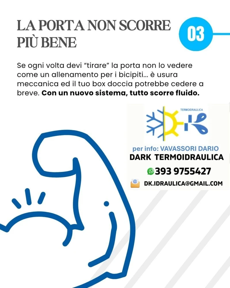 - La porta non scorre piu' bene ... se ogni volta devi "tirare" la porta non la vedere come un allenamento per i bicipiti ... è usura meccanica ed il tuo box doccia potrebbe cedere a breve; con un nuovo sistema, tutto scorre fluido.