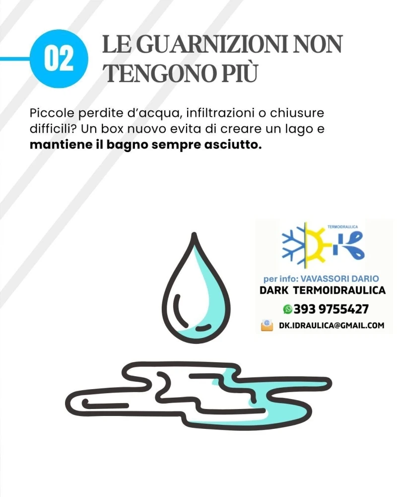 - Le guarnizioni non tengono piu' ... piccole perdite d'acqua, infiltrazioni o chiusure difficili? Un box nuovo evita di creare un lago e mantiene il bagno sempre asciutto.