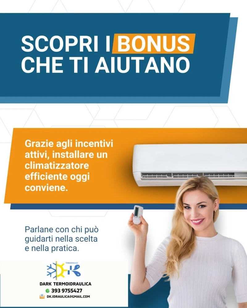 - Scopri i bonus che ti aiutano: grazie agli incentivi attivi, installare un climatizzatore efficiente oggi conviene; parlane con chi puo' guidarti nella scelta e nella pratica.