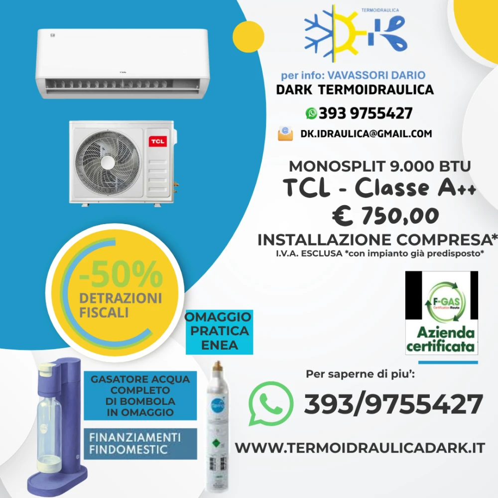MONOSPLIT TCL 9.000 BTU INVERTER CON POMPA DI CALORE E REFRIGERANTE ECOLOGICO R32 CLASSE A